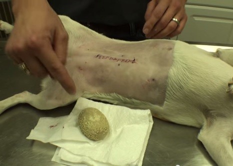 這隻流浪狗日前被送到一個動物救援組織作身體檢查,檢查後發狗狗的膀胱內有一個像肥皂般形狀大小的東西,獸醫隨即為牠開刀拿出結石。獸醫指如果狗狗沒有及時開刀就可能會性命不保,又稱這塊膀胱結石是他行醫以來見過最大的,估計已在體內形成數年時間。獸醫亦表示狗患膀胱結石的原因有很多,包括飲水不足、飲食習慣導致甚至跟品種有關,因此建議狗主要多留意狗狗的情況,發現問題就要及時送醫。