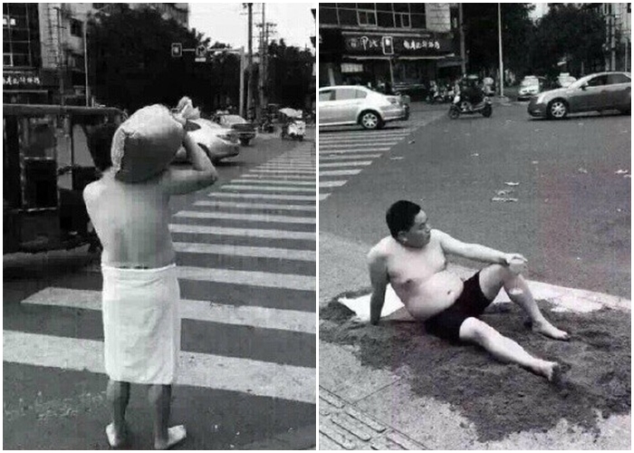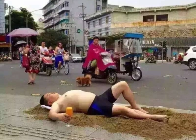 早前台灣颱風來襲,一名台男在受訪時說出「颱風就是要泛舟呀,不然要幹嘛?」,神回答配上誇張表情,除一夜爆紅外,還被封為「泛舟哥」。近日內地一名胖男亦不遑多讓,以一身泳裝打扮,躺在馬路邊曬太陽,還附上金句:「只要心裏有沙灘 那裏都是馬爾代夫」,亦在數日內紅爆內地網絡。