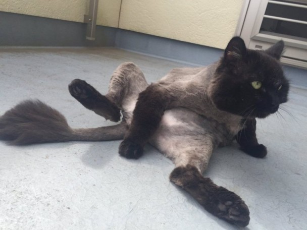 比較未剃毛前的樣子,剃毛後可謂面目全非,相信即使牠站在鏡子前,也未必認得出自己。而牠所做的動作,此刻看起來似乎也滑稽多了,不復昔日懾人氣勢。
