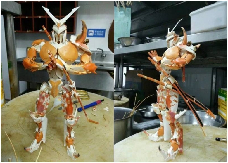「吃貨」最高境界,並不是只吃好西,也不是甚麼東西都敢嘗試───而是把吃完的蟹殼砌成一個出神入化、有外型有神髓的模型!微博今日有網民分享了一輯照片,有人在廚房內,將蟹殼廢物利用,重生砌成蟹殼模型,該蟹武士威風凜凜,雙手合十,並在腰間佩有兩把劍。